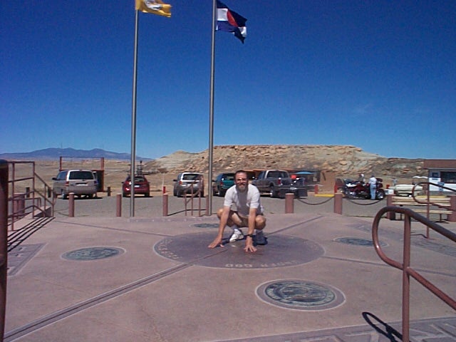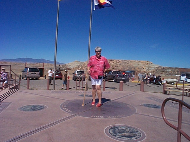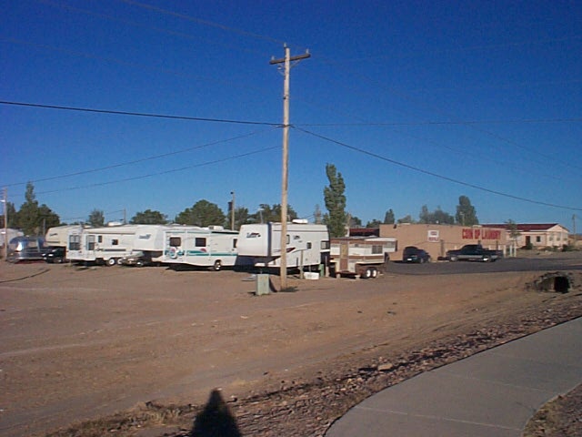 Click Pictures to Enlarge, Use Browser Back Button to Return Vacation 2001 Day: 14 Date: 06/01/2001 Well it's the last day of week two. We left the campground and drove the 16 mile south rim road of Canyon De Chelly. After being in the canyon we thought seeing it from the top would be anticlimactic but the views were spectacular and just added to our trip in the canyon. After the rim tour we headed north on 191 to 160 and then east to Four Corners where we took pictures of each other in all four states (Arizona, Utah, Colorado and New Mexico). From four Corners we headed back west on 160. Stopped for the night in Kayenta AZ. The only place we could find to stay the night was in the parking lot of the Coin Operated Laundry (But it has hook-ups). where we watched a never ending parade of Indians coming to do their laundry. Pictures: Canyon De Chelly from the south rim, Jim and Marilyn at Four Corners and Our campsite at the Coin-op Laundry.