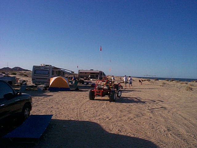 Click Pictures to Enlarge, Use Browser Back Button to Return Day 1 Date: 05/04/2002 Left San Diego 6:30AM east on Interstate 8. Stopped for breakfast in Alpine. Crossed the boarder into Mexico at Calexico/Mexicali. Drove south from Mexicali on highway 5 to San Felipe B.C. Mexico. Took Marilyn on a tour of the town (about 10 min.) then headed south to our campground "Las Conchas". Where we met up with a group of people that Jim used to go to Mexico with every year for a reunion. Our reservations got messed up so we had to set up in a temporary location for the night, no big deal. The pictures are of our temporary camp site. Domino Scores Jim: 2 Marilyn: 1 Lowest Gas Price: $1.54 Heber CA Mileage Today: 270 Mileage For Trip:270
