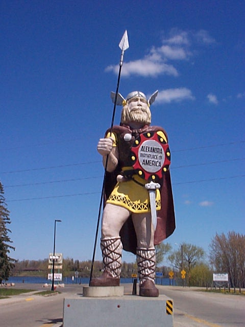 The Viking in Alexandria Click Pictures to Enlarge, Use Browser Back Button to Return Day 16 Date: 06/01/2006 Kathy fixed ham and egg omelets and French toast for breakfast. After breakfast we said goodbye and headed from Wadena to Miltona to visit Susie Lusty, one of Marilyn's cousins. After a nice visit with Susie we went to Alexandria where Marilyn grew up. In Alex we visited with Marilyn's Aunt Mary and Uncle Harry (Uncle Harry is 97) we talked for awhile then Harry drove us around town to show Marilyn some of the changes. After the tour Harry drove us to The Depot (the old train depot converted to a restaurant). Mary treated us to dinner.. After dinner we said goodbye to Mary and Harry and went over to Lil Scott's house. (Marilyn and Lil worked together at the drugstore). Arlene Linder (one of Marilyn's friends came over and Lil served coffee and cake. After our visit with Lil and Arlene it was to late to find a campground so we found the Wal-Mart and camped in the parking lot along with three other RVs. After the guy with the leaf blower and the street sweeper finished cleaning the parking lot it wasn't too noisy but they never turn off those big Lights! Domino Scores Jim: 13 Marilyn: 15 Weather: Still Hot Lowest Gas Price: $2.72 Mileage Today: 91 Mileage For Trip: 2990 |
