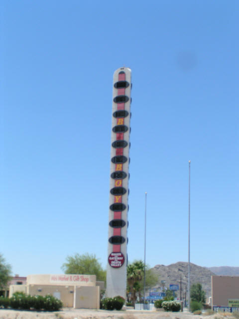 Vacation 2013, Day 01 June 08 Worlds largest thermometer at Baker CA Click pictures to enlarge First day of vacation 2013 started when we left San Diego at about 7:00AM driving north on I-15. Stopped for breakfast at Penfolds in Tamecula. We ate with our friends Jim and Betty who came down from Oregon to visit family in Tamecula. After breakfast we continued on I-15 to Las Vegas NV. We are staying at Sam's Town Boulder RV park. We are in Las Vegas to attend my granddaughter, Lily's graduation from high school on on Monday. Had supper at Billy Bob's Steak House in Sam's Town with my daughter Cheryl, my granddaughters Lily and Rachel and Rachel's husband. Domino Scores Jim: 2 Marilyn: 1 Weather: Hot, 113 Lowest Gas Price: $3.469 Mileage Today: 347 Mileage For Trip: 347 Copyright 2013