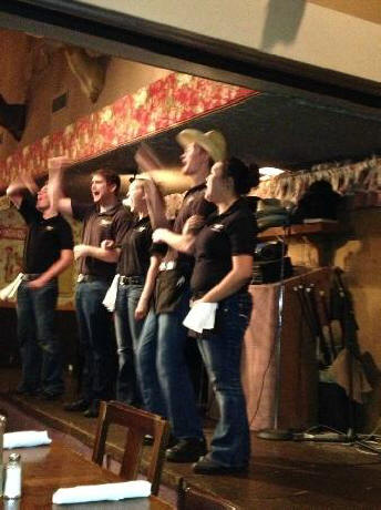Vacation 2013, Day 60 August 06 Black Bart's RV Park Steak House Saloon and Musical Review Click pictures to enlarge Breakfast in the RV. Back on I-40 West. Stopped at Winslow AZ for fuel. Continued on I-40 West to Flagstaff AZ. Staying at Black Bart's RV Park. Had supper at Black Bart's Steak House Saloon and Musical Review. The servers in the restaurant all perform in the musical review. Domino Scores Jim: 119 Marilyn: 124 Weather: Started out sunny with scattered clouds. As we went into Arizona it got cloudy with some showers. It's cool in Flagstaff (7000ft). Lowest Gas Price: $3.459 Mileage Today: 328 Mileage For Trip: 8884 Copyright 2013